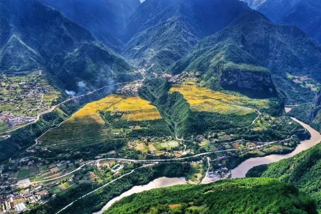 過了怒江第一灣,就到了丙中洛。站在觀景臺上,一邊是人神共居之地——丙中洛。另一邊是怒江上另一顆粉色寶石——桃花島。丙中洛鎮(zhèn)是一片比較平的坡地,四周被群山環(huán)抱,滿目蒼翠。放眼是美麗的田野風光。層層梯田一片金黃,阡陌田園之間,又是綠樹叢林相間。一彎怒江沿著大山邊緣,畫了個弧線流向右方,真是分不清楚是“蓬萊仙閣”還是“人間仙境”。