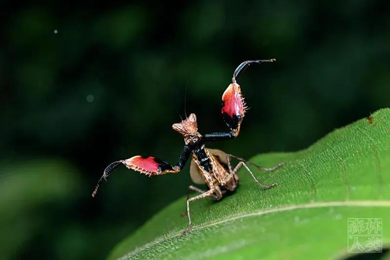 獨龍巨腿螳受驚嚇時常亮出足內(nèi)側(cè)的華麗斑紋威嚇對方。
