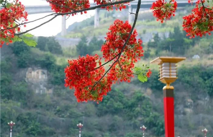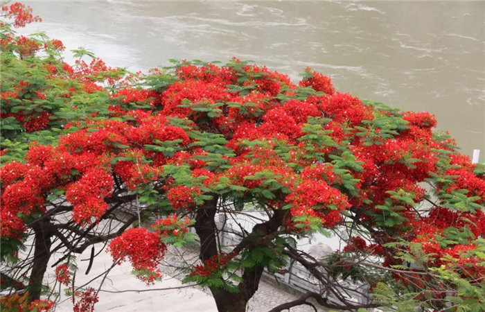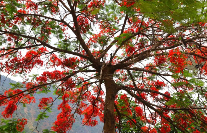 鳳凰木,又名紅花楹、鳳凰樹、金鳳、火鳳凰等,性喜高溫多濕的環(huán)境,必須在陽光充足處才能繁茂生長,花期一般為5月至7月,花開五瓣,因其葉如飛凰之羽,花若丹鳳之冠,故取名鳳凰花。