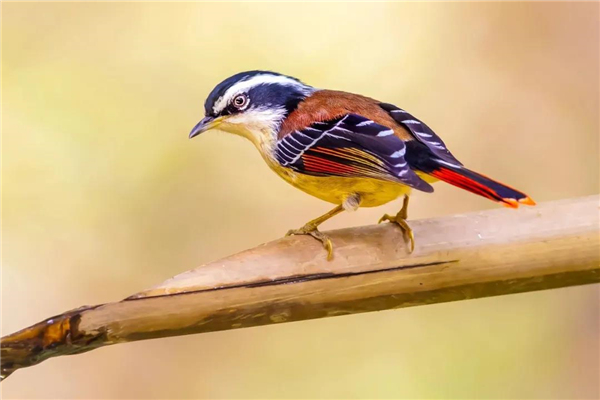 火尾希鹛是小型林鳥,與其他兩種鳥相比,火尾希鹛的紅色尾羽顯得更小巧。