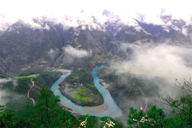 丙中洛鎮(zhèn)日丹村附近的U型大拐彎,是怒江大峽谷中最具代表性的景觀之一,怒江因?yàn)橛龅酵躞浯髴規(guī)r絕壁和丹拉大山