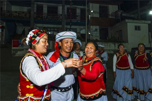 火塘邊,用竹簸箕盛滿石板粑粑、漆油雞、琵琶肉,與當(dāng)?shù)厝私槐诧嫛巴木啤?,傈僳調(diào)子唱醉峽谷夜。
