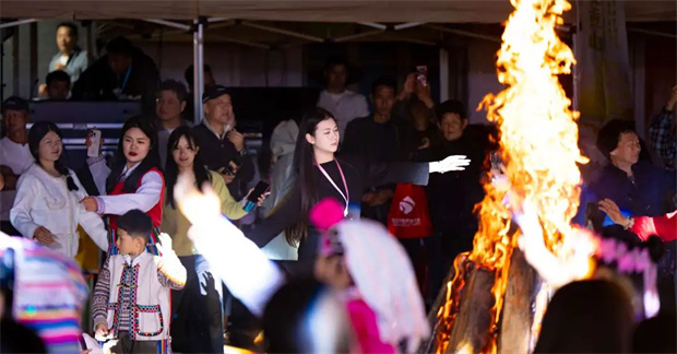 到了晚間,熊熊篝火燃起,來自四方的游客與當?shù)馗髯迦罕娨黄饑@篝火載歌載舞。我拿著相機躊躇,不知道如何加入