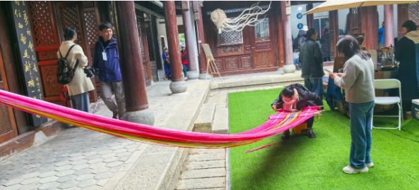 獨龍?zhí)褐谱骷妓囌古_前,傳承人現(xiàn)場演示腰機織布法,演繹著這項古老技藝的精湛魅力。此次有2家獨龍?zhí)褐谱骷妓嚪沁z工坊參展,獨龍?zhí)合盗挟a(chǎn)品兼具傳統(tǒng)底蘊與現(xiàn)代美學(xué),除經(jīng)典毯品外,還有與上海秉波等企業(yè)合作開發(fā)的包、披肩、靠枕、筆記本、香囊等多款文創(chuàng)衍生品。參展期間,參展人員與其他省內(nèi)外的非遺進行了交流,并與多家企業(yè)達成合作意向。